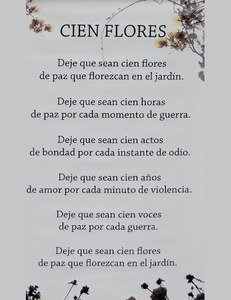 100 Flowers is one of the most widely translated poems and is currently translated into in 105 languages. The goal of the 100 Flowers project is to inspire people, to take action for peace, no matter what language they speak, no matter what country they are from. The 100 Flowers for Peace banners have been installed at the Fellowship of Reconciliation headquarters, the Peace Abbey in Massachusetts, the Villa Grimaldi Peace Park in Santiago Chile, the Clearwater Festival in New York, and at peace and community centers around the world. These banners can be installed inside your building or outside; either as a temporary or permanent exhibit. These vinyl banners are 2 feet by 18 inches wide (600 cm x 45 cm) and there are 25 of them; with one language each side.